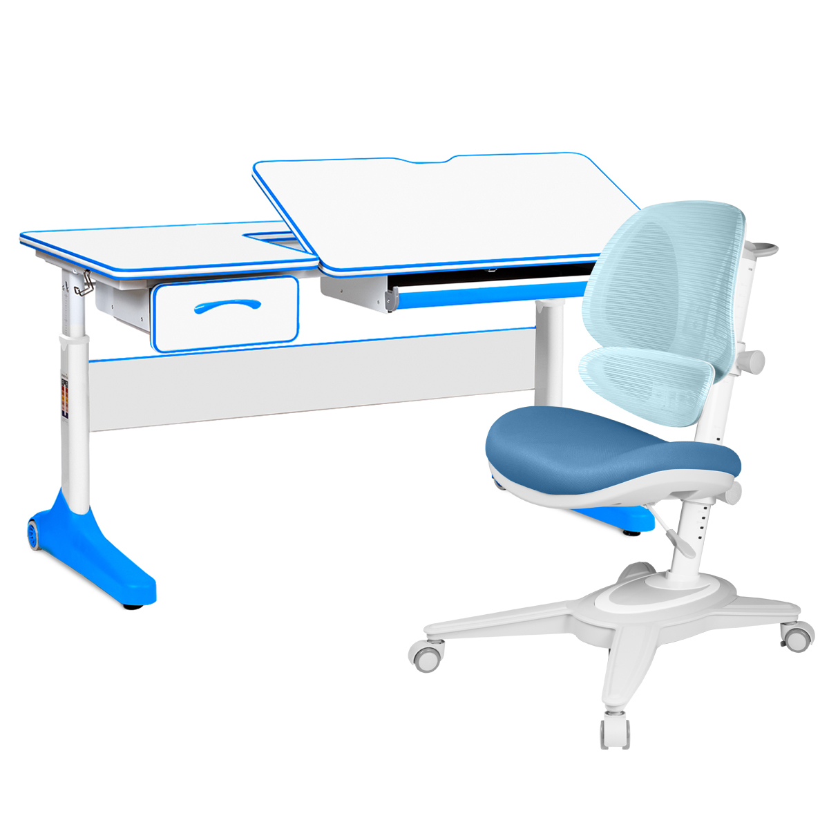Раздельная конфигурация поверхности стола: наклонная часть регулируется под углом до 60 градусов, что позволит вам выбрать максимально удобный угол наклона для письма, чтения и рисования; фиксированная часть даст дополнительное пространство для хранения книг и других необходимых предметов. Ящик-органайзер разделен на отсеки, для удобного хранения канцелярских товаров. В боковую полку удобно сложить более крупные необходимые для учебы предметы.